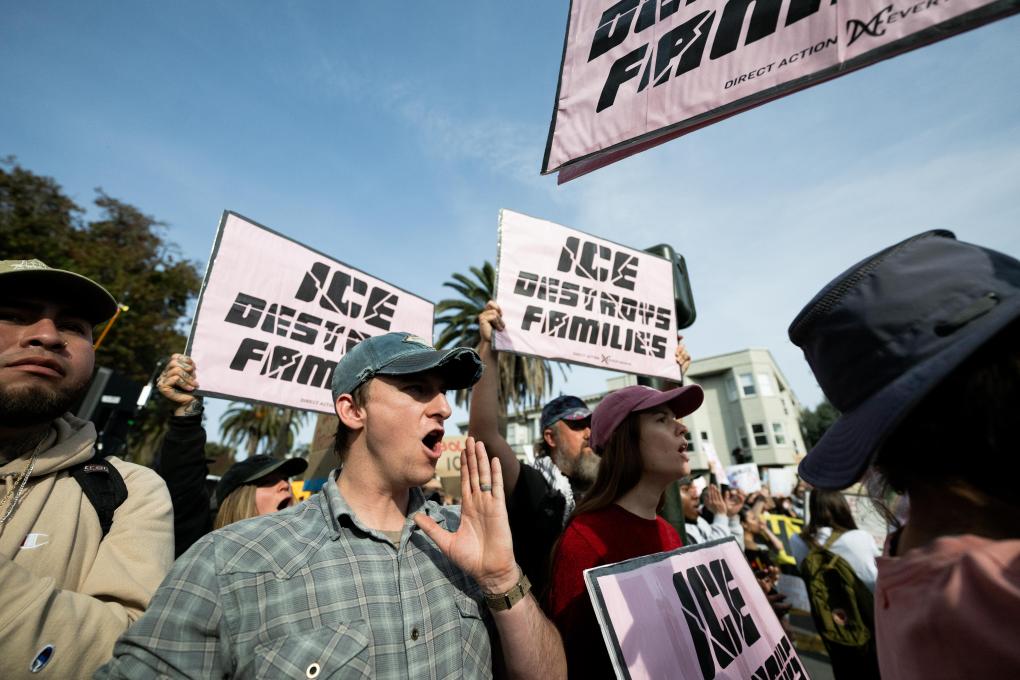 2026年1月30日,人們?cè)诿绹?guó)加利福尼亞州舊金山參加示威游行,抗議特朗普政府暴力移民執(zhí)法。新華社發(fā)(朱子于攝)