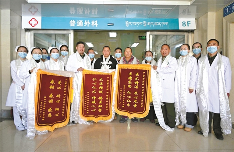 圖為患者出院時給西藏軍區(qū)總醫(yī)院普通外科醫(yī)療團(tuán)隊贈送錦旗。通訊員 西培多杰 攝