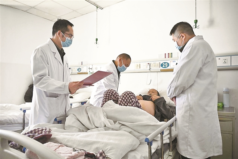 圖為西藏軍區(qū)總醫(yī)院普通外科專家團(tuán)隊在查房,普布次仁醫(yī)生(左二)對患者進(jìn)行腹部檢查。通訊員 西培多杰 攝