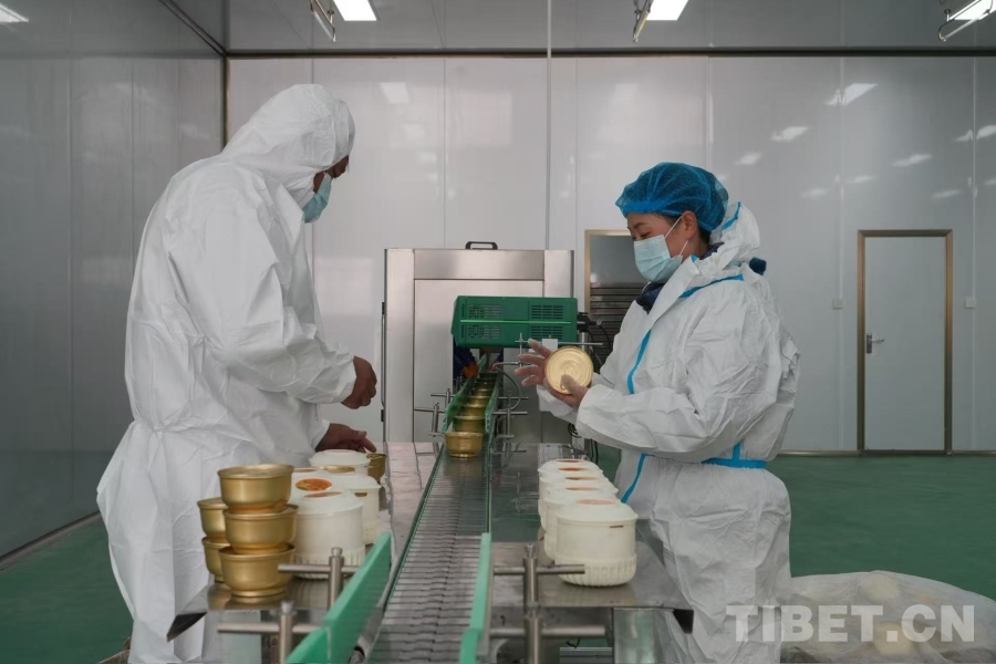 圖為邊壩縣藏香雞產(chǎn)業(yè)養(yǎng)殖基地工作人員正在打包罐頭