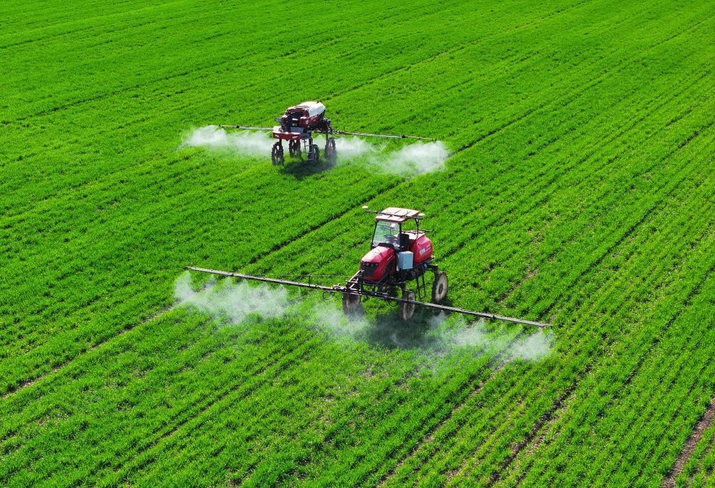 3月19日,自走式無人植保機在安徽省亳州市譙城區(qū)趙橋鄉(xiāng)雙樓村的無人農(nóng)場進行除草作業(yè)(無人機照片)。新華社記者 杜宇 攝