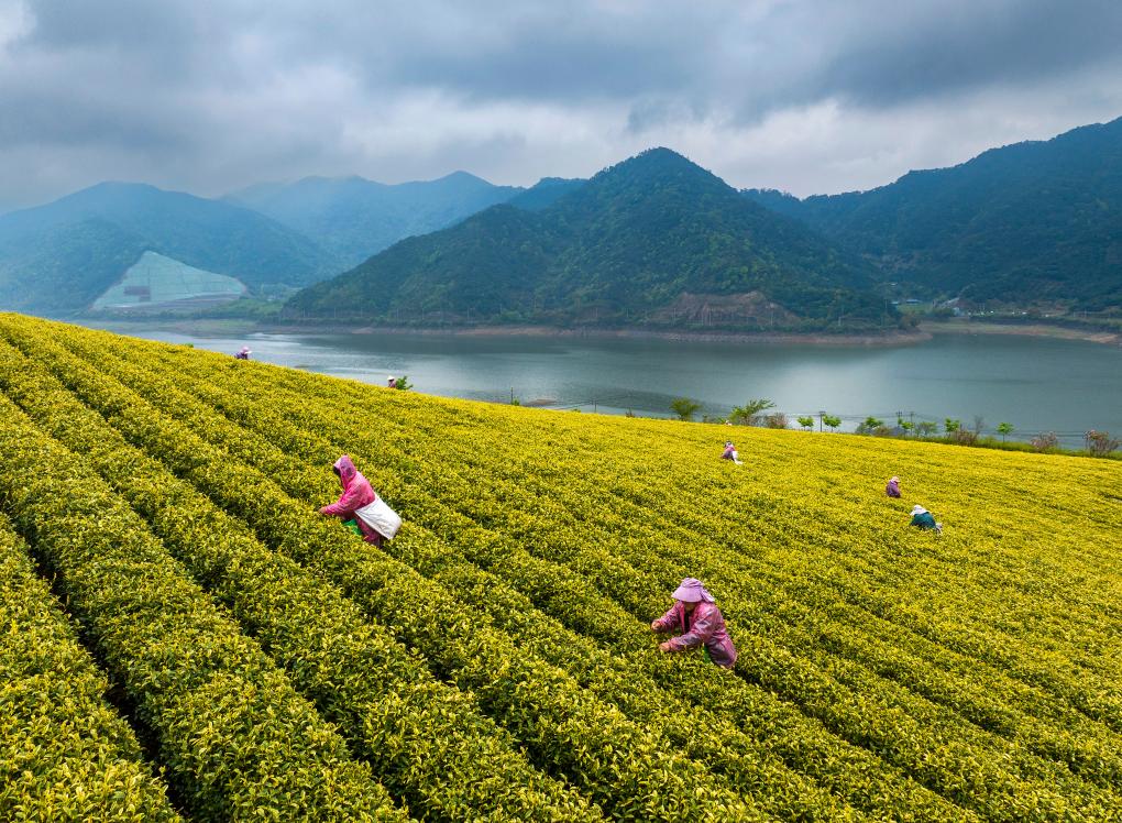 4月7日,茶農(nóng)在浙江省寧波市鄞州區(qū)橫溪茶園采茶(無人機照片)。新華社發(fā)(胡學軍攝)
