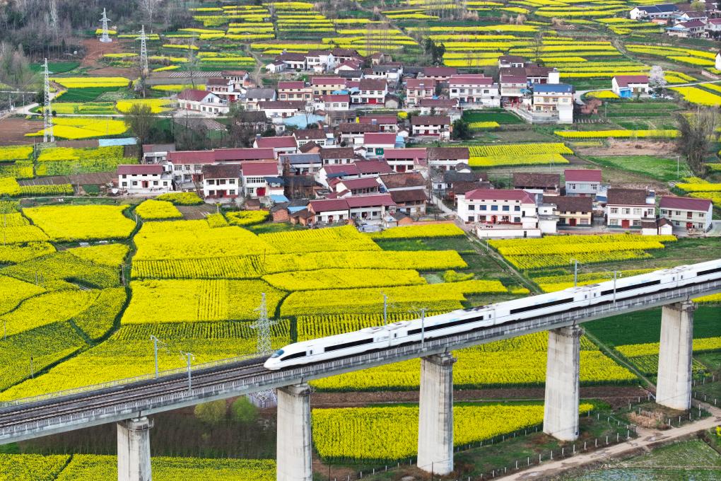 3月20日,西成高鐵線上的列車駛過陜西漢中市南鄭區(qū)陽春鎮(zhèn)(無人機照片)。新華社記者 邵瑞 攝