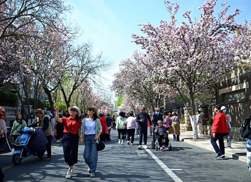 市民在海棠花盛開的五大道大理道上拍照打卡(4月7日攝)。
