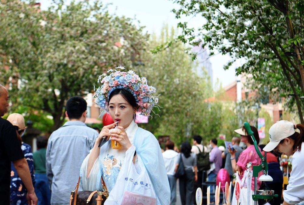 游人在天津市和平區(qū)五大道漫步賞花(4月10日攝)。