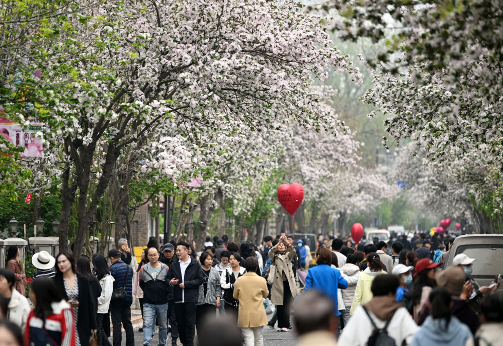 游客在海棠花盛開的五大道大理道上漫步休閑(4月7日攝)。