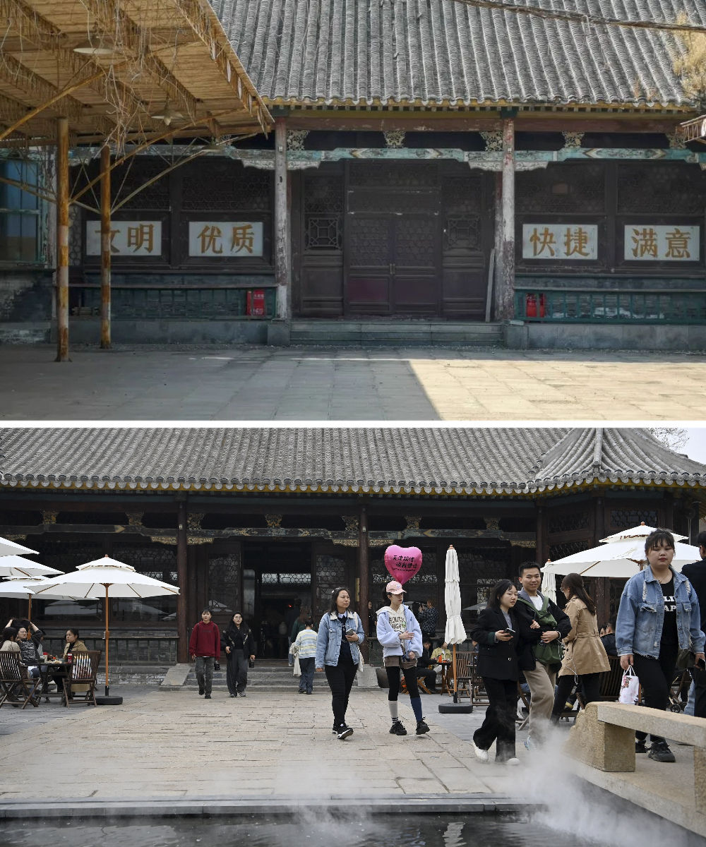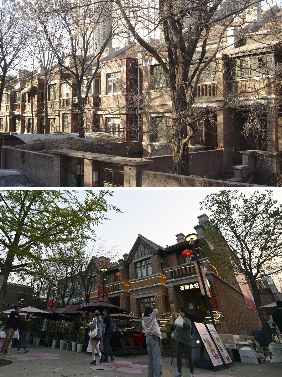 拼版照片:上圖是改造前的先農(nóng)大院(資料照片)。下圖是游客在位于五大道的先農(nóng)大院內(nèi)游覽(4月6日攝)。始建于1925年的先農(nóng)大院是五大道建成最早的建筑群之一,融合了英式聯(lián)排住宅、英式獨(dú)棟別墅等多種特色的建筑風(fēng)格。歲月變遷,這些建筑一度損壞嚴(yán)重,配套設(shè)施老化。2006年起,天津啟動先農(nóng)大院整理項目,對街區(qū)居民進(jìn)行了騰遷,對建筑進(jìn)行了加固修繕,恢復(fù)了街區(qū)的歷史原貌,引進(jìn)了餐飲、文化展示、辦公等業(yè)態(tài),使這里形成了環(huán)境優(yōu)雅的公共藝術(shù)和展示建筑遺產(chǎn)的城市新空間。