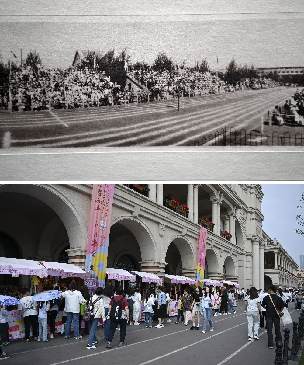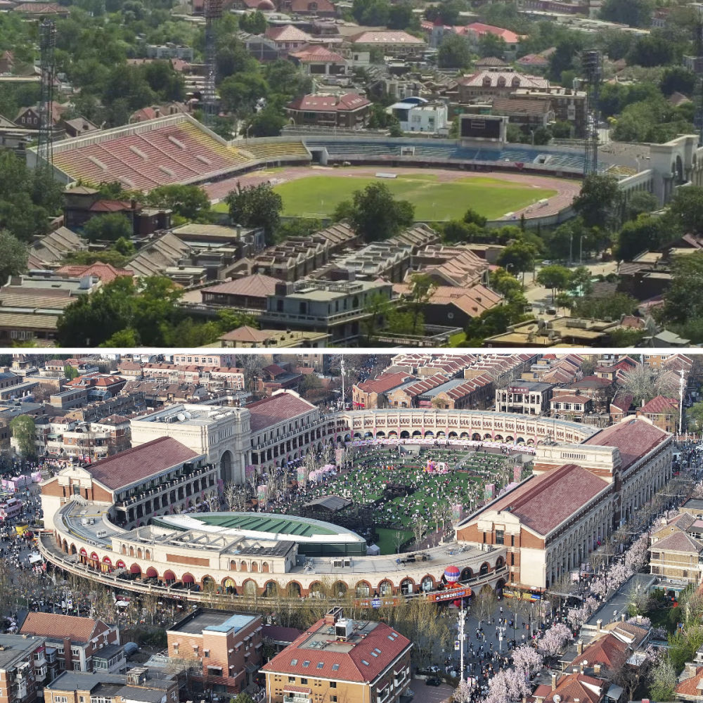 拼版照片:上圖是位于五大道的民園體育場(資料照片);下圖是位于五大道的民園廣場(4月6日攝)。民園廣場的前身是始建于1920年的民園體育場,這里也是中國的第一個燈光足球場。經(jīng)過提升改造,現(xiàn)在的民園廣場已經(jīng)成為中西合璧的“城市會客廳”。