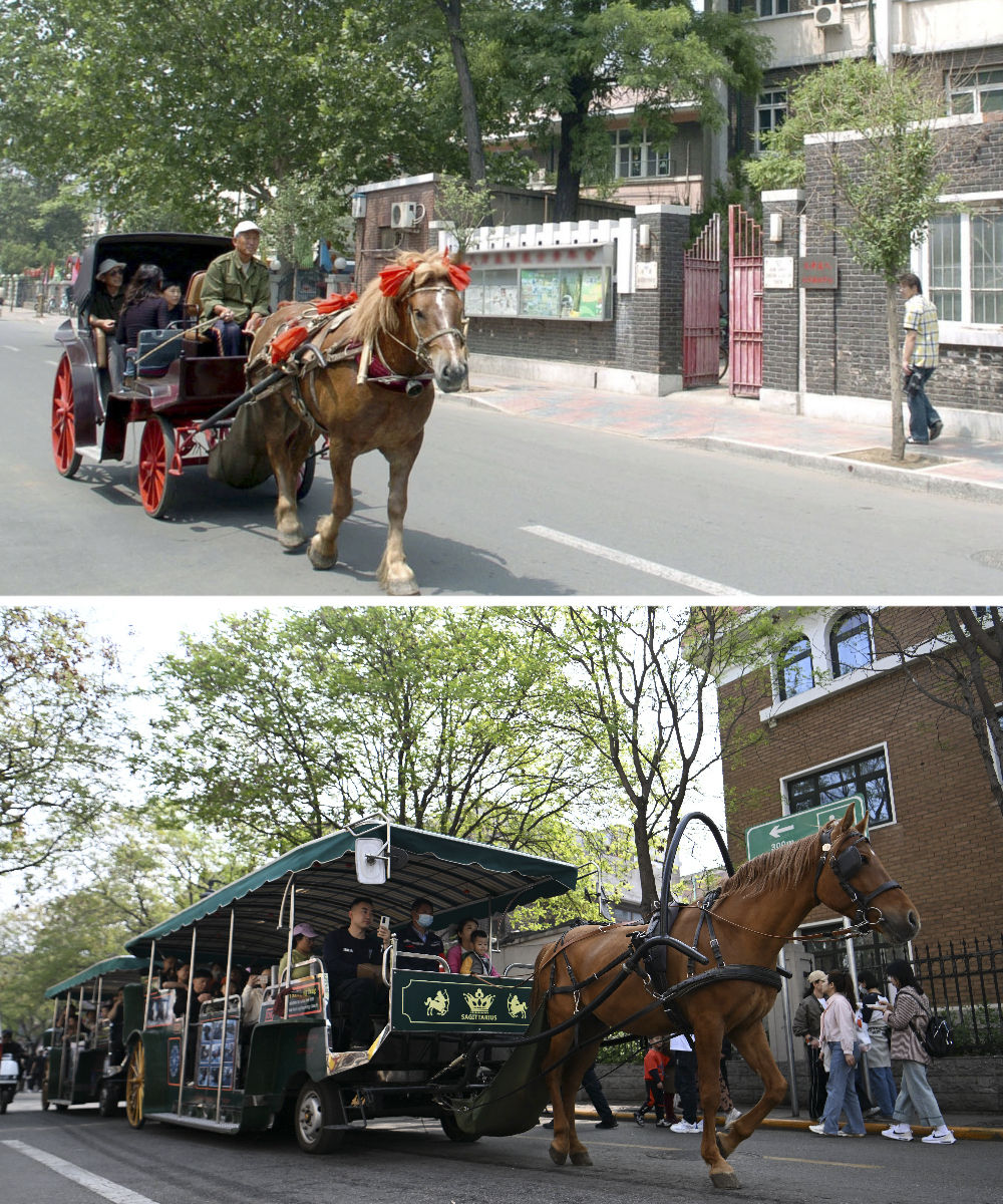 拼版照片:上圖是游客乘坐四輪馬車游覽天津五大道(2005年6月2日攝);下圖是游客乘坐觀光馬車游覽天津五大道(2024年4月13日攝)。
