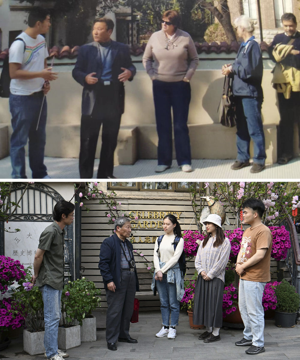 拼版照片:上圖是2011年金彭育(左二)在五大道和平賓館義務(wù)為外國游客講解;下圖是金彭育(左二)在五大道上為游客義務(wù)講解(4月13日攝)。