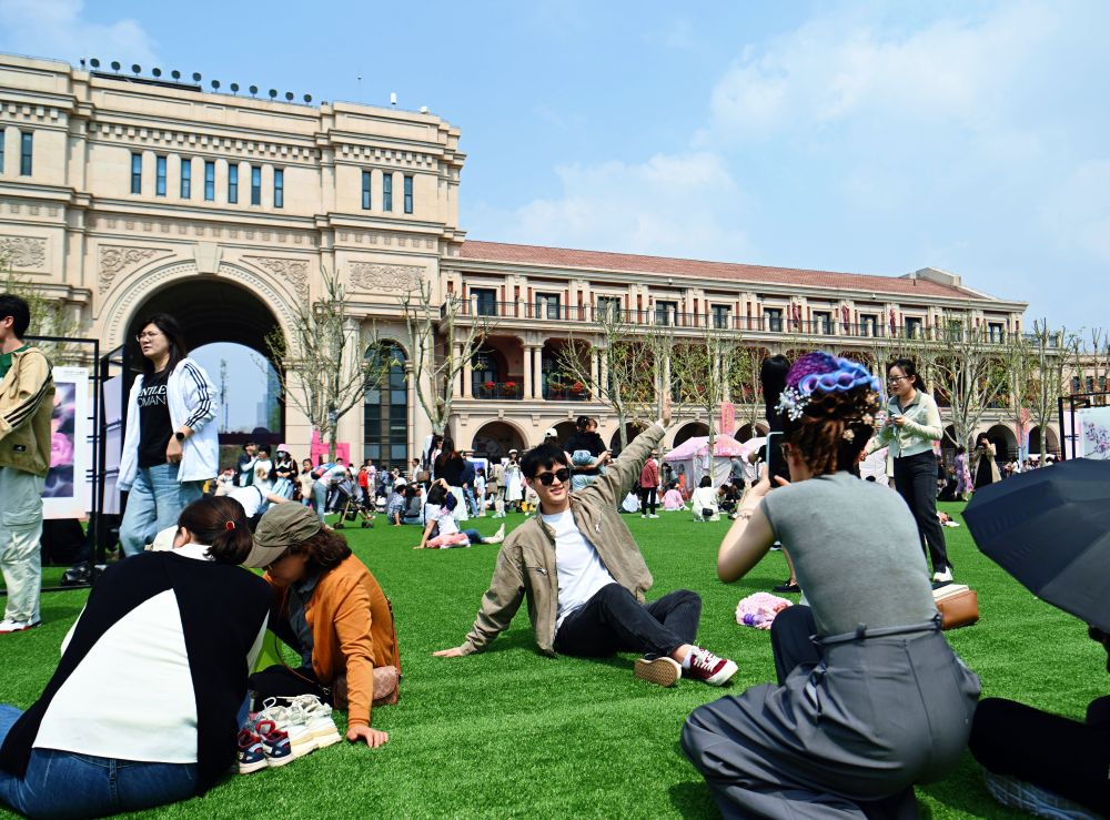 游客在五大道民園廣場休閑游玩(4月13日攝)。