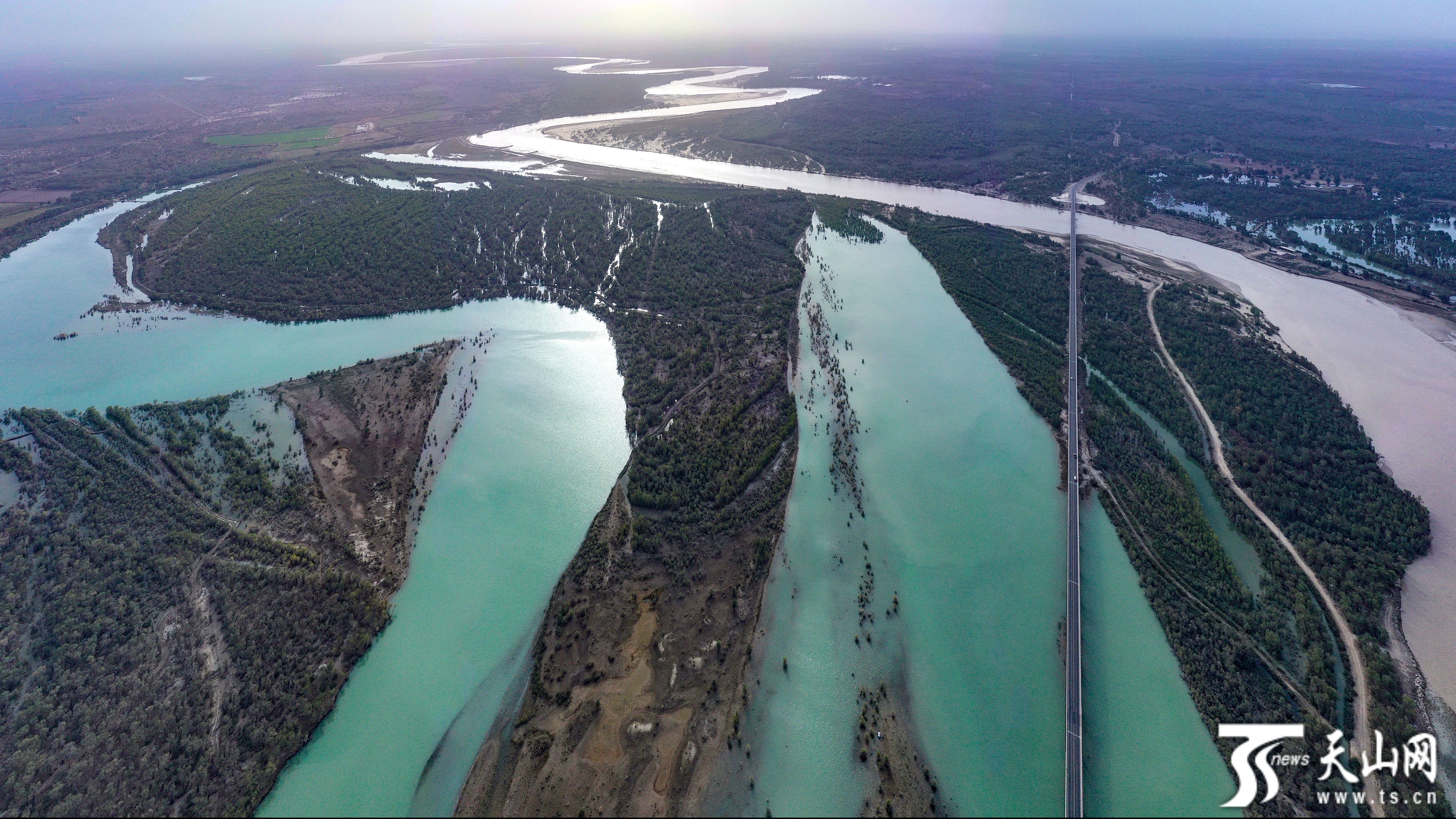2023年9月7日,塔里木河蜿蜒流淌,兩岸旁沙雅縣境內(nèi)分布的290余萬畝原始胡楊林在河水滋潤下生機盎然。蔡增樂攝