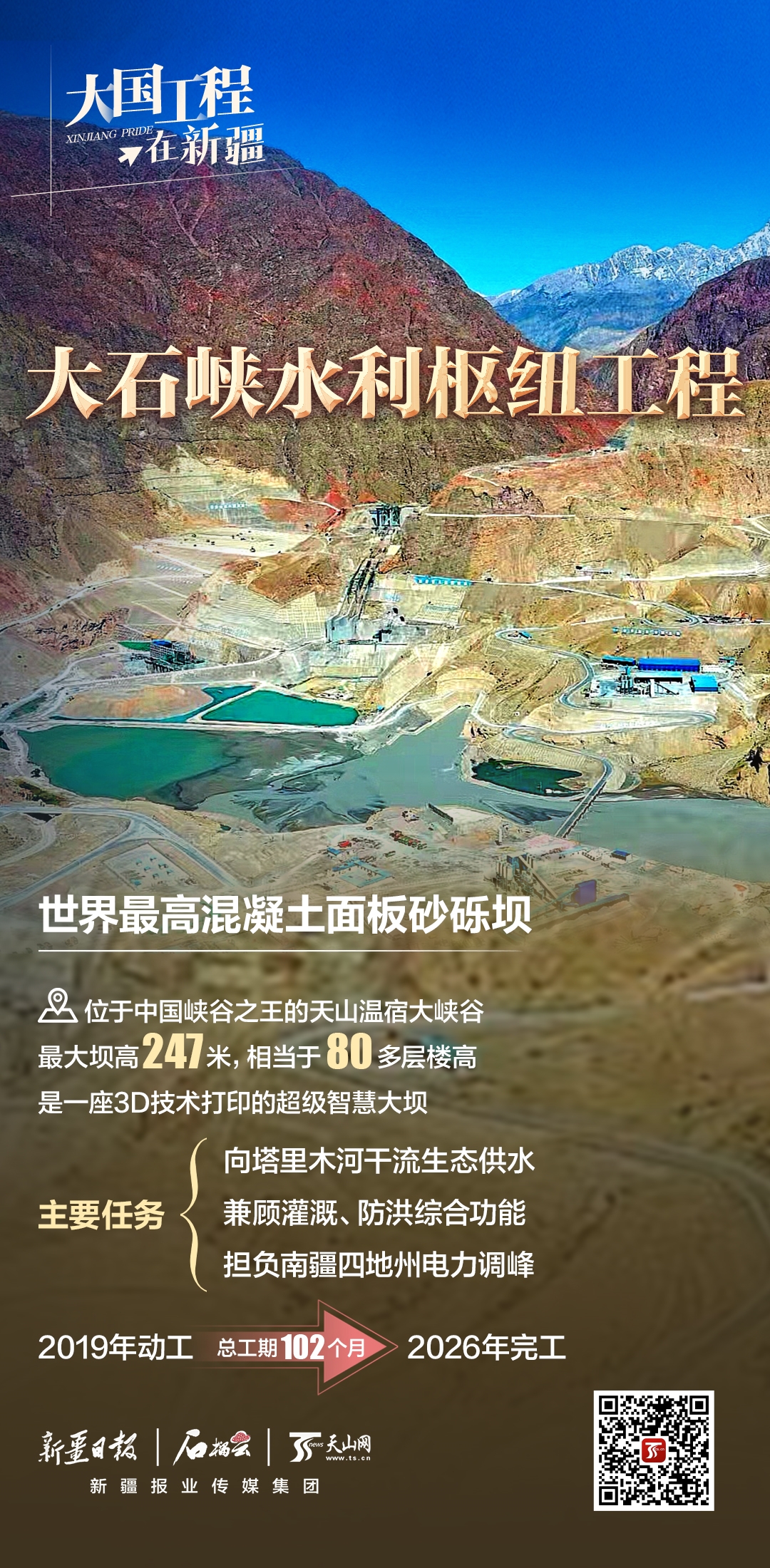 新疆大石峽水利樞紐工程建在號稱中國峽谷之王的天山溫宿大峽谷之中,攔河壩主壩為混凝土面板砂礫石壩,最大壩高247米,壩頂長度606米,比三峽大壩還高62米,是當之無愧的天塹工程。