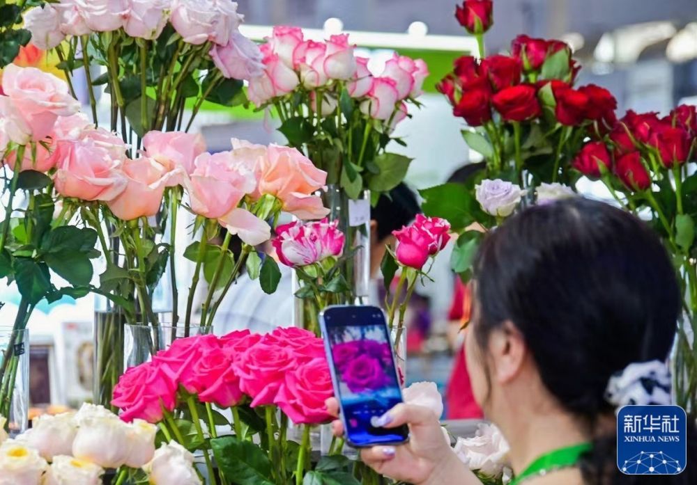 觀眾在國貨特色潮品展區(qū)云南展臺拍照,云南展臺為本屆消博會準備了8000余支、20多個品種的云南本土鮮切玫瑰。新華社記者王楚天 攝