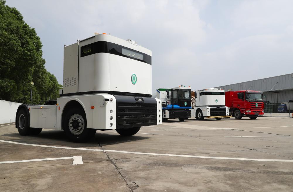 一輛西井科技的無人駕駛重卡Q-Truck(前)在位于上海的無人駕駛商用車聯(lián)合實(shí)驗(yàn)室場(chǎng)地上進(jìn)行動(dòng)態(tài)測(cè)試(2023年9月26日攝)。 新華社記者 方喆 攝