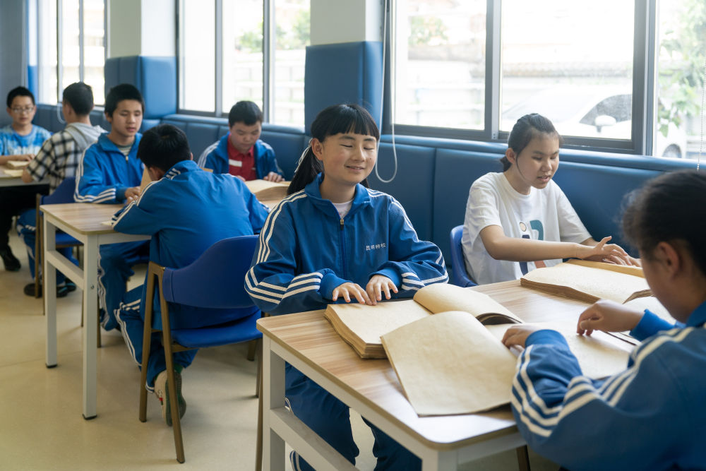 4月15日,昆明市盲啞學校的盲生們在學校圖書室閱讀盲文書。(新華社記者 陳欣波 攝)