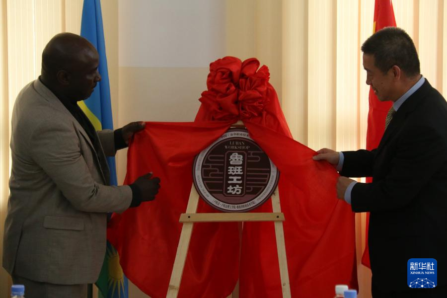 2023年11月18日,在盧旺達(dá)北方省穆桑澤職業(yè)技術(shù)學(xué)院,中國(guó)駐盧旺達(dá)大使王雪坤(右)與盧旺達(dá)北方省省長(zhǎng)莫里斯·穆加博瓦加洪德共同為盧旺達(dá)魯班工坊揭牌。新華社發(fā)(黃萬(wàn)晴攝)