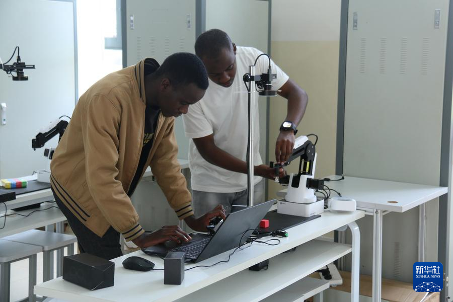 2023年11月18日,在盧旺達(dá)北方省穆桑澤職業(yè)技術(shù)學(xué)院魯班工坊的實(shí)驗(yàn)室中,兩名當(dāng)?shù)貙W(xué)生操作儀器。新華社發(fā)(黃萬(wàn)晴攝)