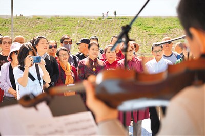 “我愛你,中國。我要把美好的青春獻給你,我的母親,我的祖國!”在軍墾之聲合唱團的帶領(lǐng)下,市民游客一起合唱《我愛你,中國》,歌聲嘹亮,場面熱烈。
