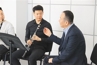 中國交響樂團副團長、單簧管首席尹波(右一)指導(dǎo)新疆藝術(shù)學(xué)院學(xué)生。
