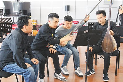新疆藝術(shù)學(xué)院師生為中國交響樂團作曲家楊帆(左一)展示彈撥爾樂器。