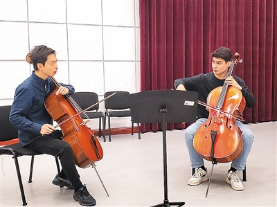 中國交響樂團大提琴副首席李成(左)指導(dǎo)新疆藝術(shù)學(xué)院學(xué)生。