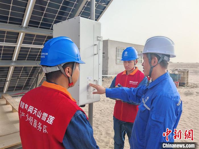 國網(wǎng)阿克蘇供電公司工作人員來到沙雅中電建25萬千瓦光伏項(xiàng)目現(xiàn)場,檢查光伏場站逆變器運(yùn)行情況。(馬海驕 攝)