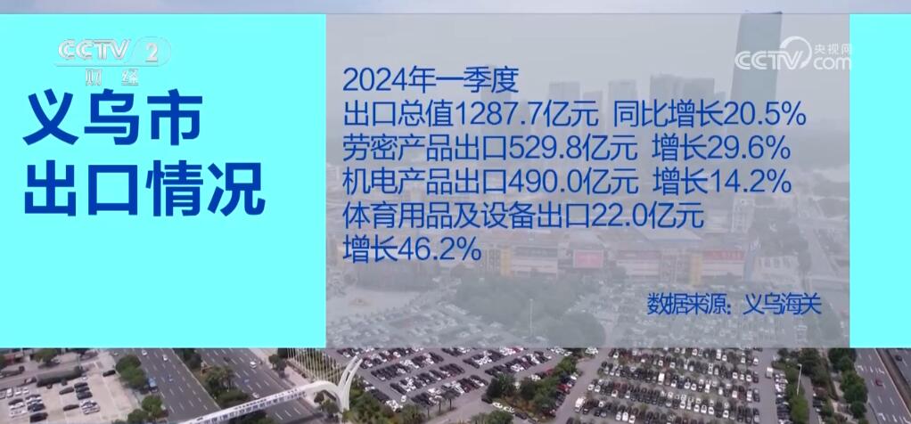 數(shù)據(jù)顯示,2024年一季度,義烏市出口總值達(dá)1287.7億元,同比增長(zhǎng)20.5%。其中,勞密產(chǎn)品出口529.8億元,增長(zhǎng)29.6%;機(jī)電產(chǎn)品出口490.0億元,增長(zhǎng)14.2%;而體育用品及設(shè)備出口達(dá)到22.0億元,增長(zhǎng)46.2%。業(yè)內(nèi)人士表示,巴黎奧運(yùn)會(huì)即將召開(kāi),以及外商圣誕采購(gòu)季開(kāi)始,歐美市場(chǎng)補(bǔ)庫(kù)存需求增加,使得相關(guān)產(chǎn)品出口占比顯著提升。