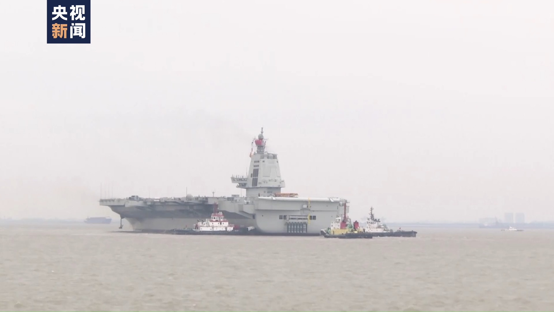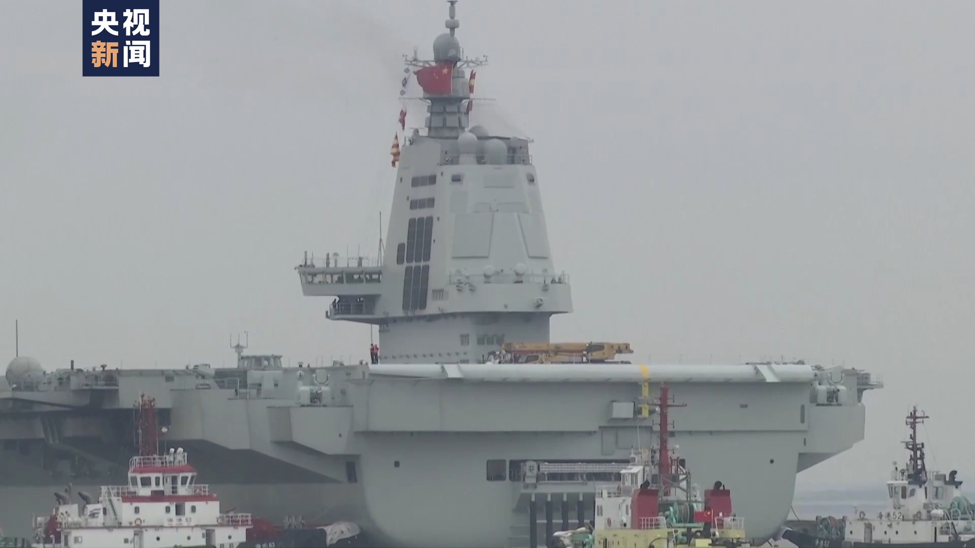 我國(guó)第三艘航空母艦福建艦在多艘拖船的牽引下,正在緩緩地駛離上海江南造船廠的碼頭,赴相關(guān)海域開(kāi)展首次航行試驗(yàn)。
