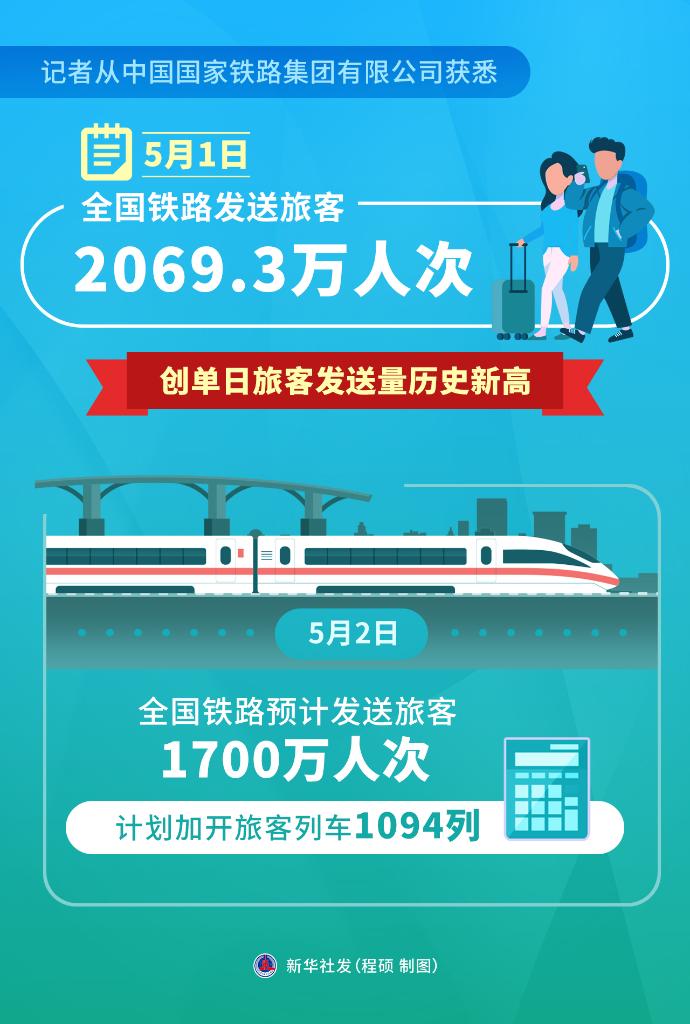 記者從中國(guó)國(guó)家鐵路集團(tuán)有限公司獲悉,5月1日,全國(guó)鐵路發(fā)送旅客2069.3萬人次,創(chuàng)單日旅客發(fā)送量歷史新高。5月2日,全國(guó)鐵路預(yù)計(jì)發(fā)送旅客1700萬人次,計(jì)劃加開旅客列車1094列。