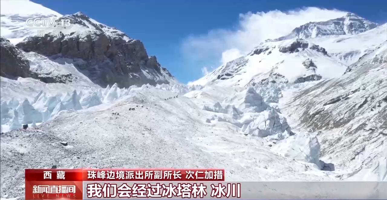珠峰邊境派出所副所長(zhǎng) 次仁加措:往里走的話我們會(huì)經(jīng)過(guò)冰塔林、冰川,穿越碎石灘,整個(gè)路途我們會(huì)花費(fèi)8到12個(gè)小時(shí),途中經(jīng)過(guò)老大本營(yíng),那個(gè)地方是最危險(xiǎn)的路段。