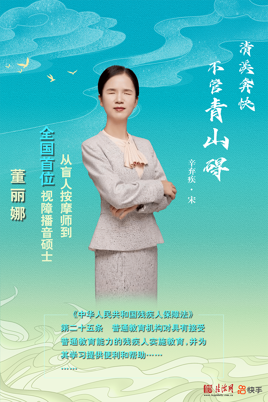 董麗娜先天弱視,10歲失明。但她自強(qiáng)不息、排除萬難,在22歲時(shí)爭(zhēng)取到視障人士播音培訓(xùn)機(jī)會(huì),獲得一級(jí)甲等普通話證書,成為《麗娜品讀時(shí)間》的主持人。2020年考入中國(guó)傳媒大學(xué)攻讀碩士學(xué)位,2023年畢業(yè)成為全國(guó)首位視障播音碩士。
