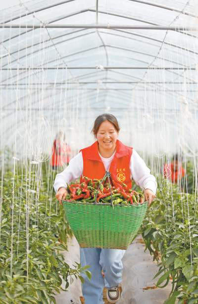 福建省南安市金淘鎮(zhèn)的蔬菜基地內(nèi),晨光村網(wǎng)格員幫助農(nóng)戶搬運采摘下的辣椒。 謝貴明攝(影像中國)