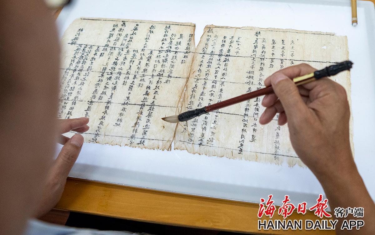 黃文鋒在給古籍補粘紙張 。海南日報記者袁琛 攝