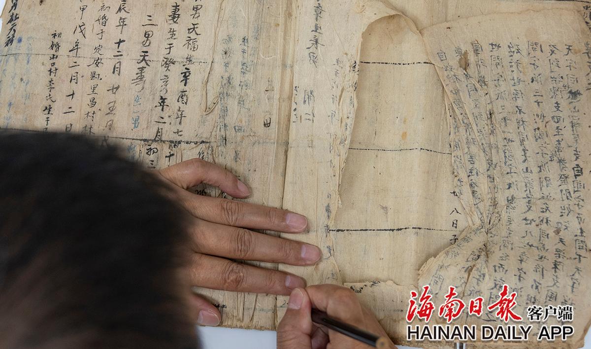 黃文鋒在查看古籍紙張破損情況。海南日報記者袁琛 攝