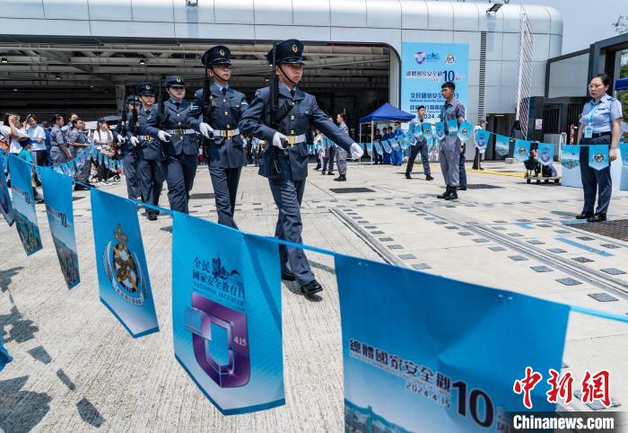 4月13日,香港特區(qū)政府保安局下轄的各紀律部隊舉行“全民國家安全教育日”開放日活動。圖為香港航空青年團成員在政府飛行服務隊開放日活動上展示中式步操。(資料圖片) 中新社記者 侯宇 攝