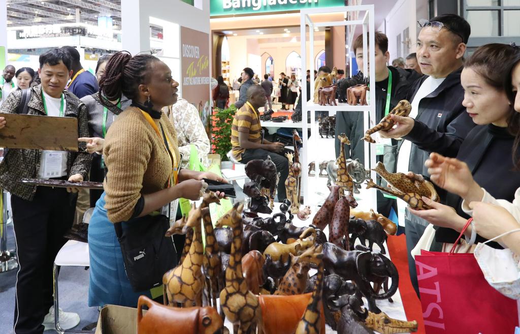 2023年11月6日,來(lái)自津巴布韋的艾薇頓絲·察卡瓦在展臺(tái)向參觀者介紹木雕展品。這是她第一次來(lái)到中國(guó)上海參加進(jìn)博會(huì),這些木雕都是她的哥哥在家里制作的,她想通過(guò)進(jìn)博會(huì)為哥哥的木雕作品找到好的銷路。新華社記者方喆攝