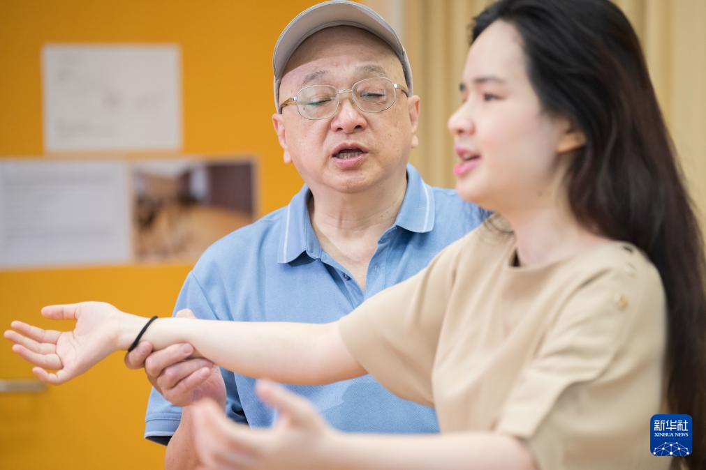 4月22日,蕭輝德(左)幫助蕭凱恩排練。新華社記者 朱煒 攝