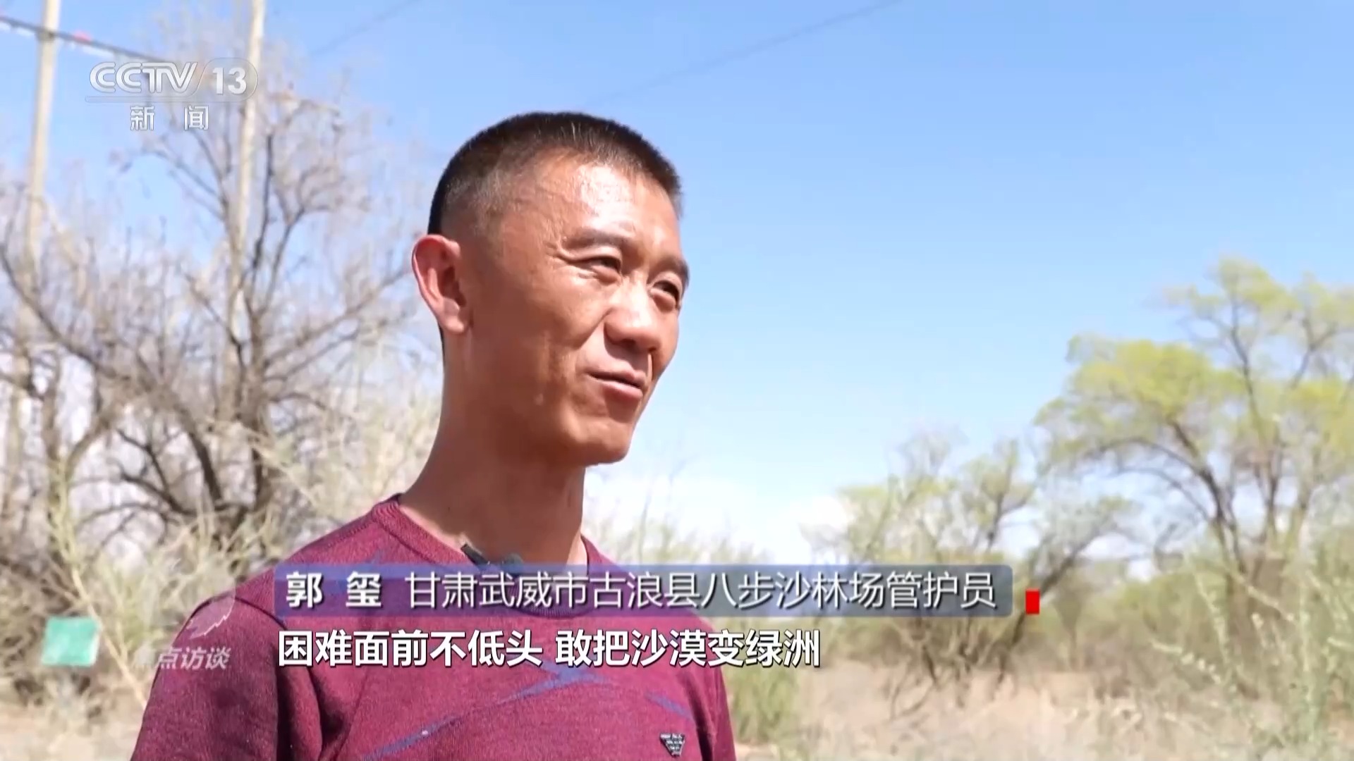 甘肅武威市古浪縣八步沙林場管護(hù)員 郭璽:總書記跟我說,困難面前不低頭,敢把沙漠變綠洲。我們要一代一代傳承下去,我爺爺他們幾十年種下的樹不能到我們手里死掉。