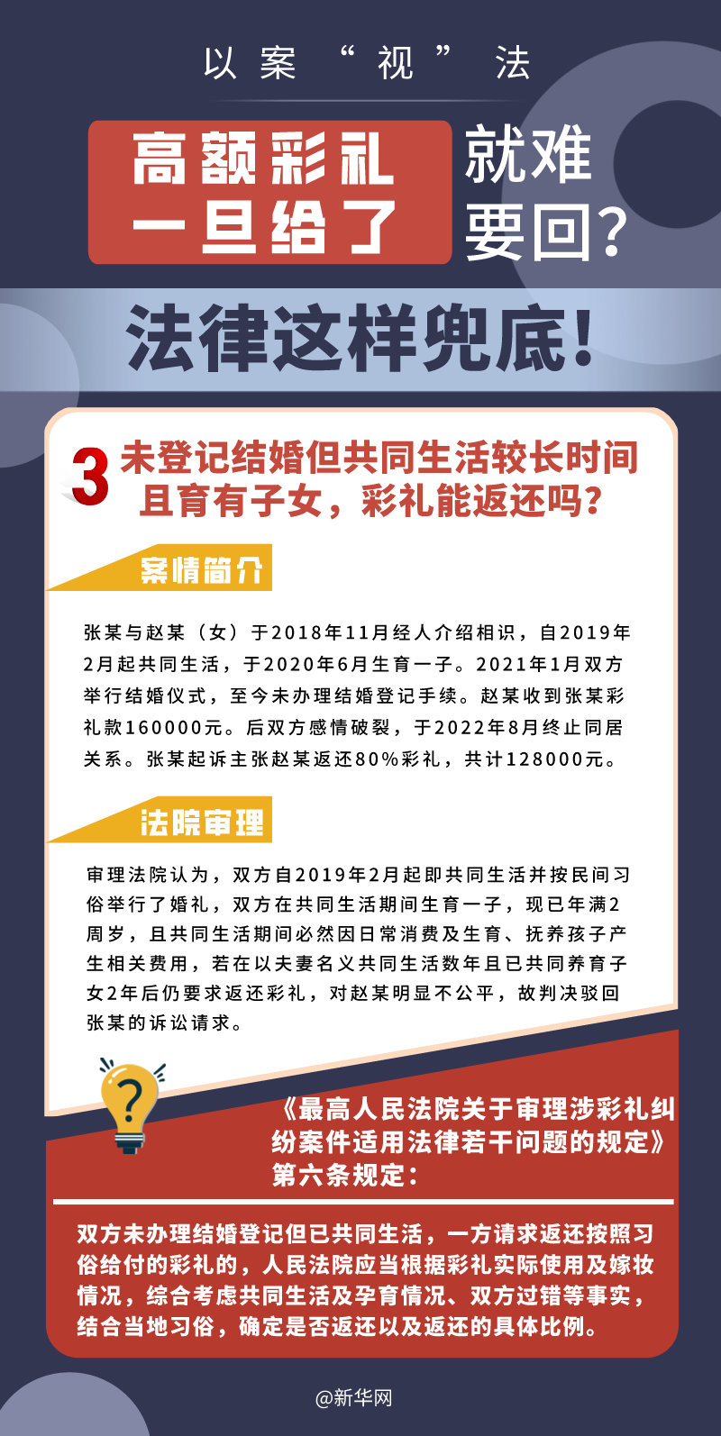 “五一”長假期間,各地迎來了婚禮高峰期,“彩禮”話題,尤其農(nóng)村高額彩禮現(xiàn)象備受關(guān)注。破解高價彩禮,在解決爭議的層面,司法盡了最大努力兜底。本期《以案“視”法》針對涉“高額彩禮”糾紛,帶大家學(xué)習(xí)相關(guān)法律知識。
