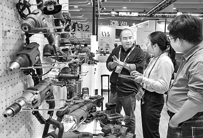 印尼零售企業(yè)在廣交會(huì)五金工具展區(qū)了解中國企業(yè)的展品。新華社發(fā)