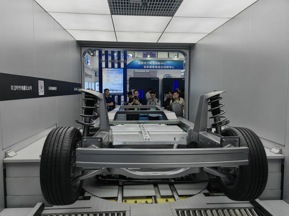 這是在四川省宜賓市舉行的2023世界動(dòng)力電池大會(huì)上展示的新能源汽車換電系統(tǒng)(2023年6月9日攝)。新華社記者 胡旭 攝