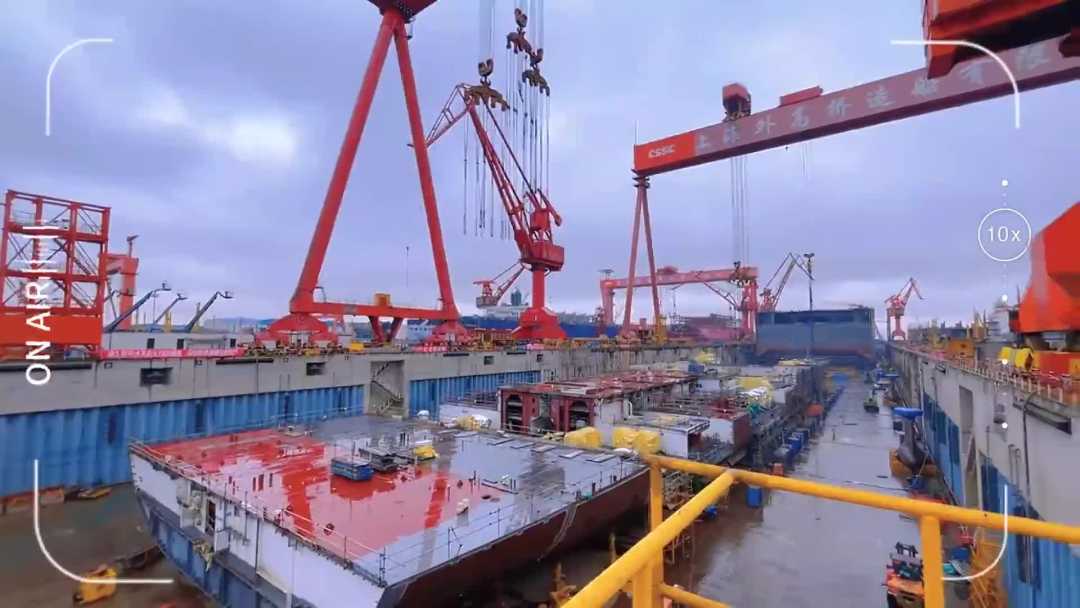 兩臺龍門吊緩緩起降,有序吊裝船體部件——中國船舶集團(tuán)上海外高橋造船2號船塢,第二艘國產(chǎn)大型郵輪不久前在這里迎來下塢搭載總裝節(jié)點。