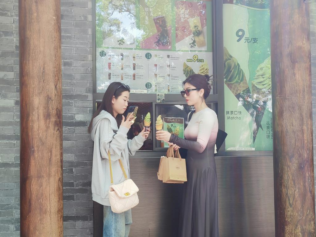 5月8日,位于東四大街的吳裕泰茶莊門口,兩名女士在購(gòu)買冰激凌。新華社記者謝希瑤 攝