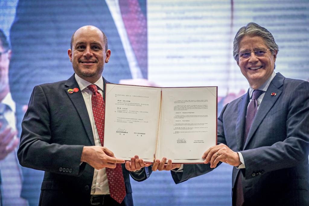 2023年5月10日,厄瓜多爾總統(tǒng)拉索(右)與厄瓜多爾生產(chǎn)、外貿(mào)、投資和漁業(yè)部部長(zhǎng)普拉多在厄瓜多爾基多展示中厄自貿(mào)協(xié)定文件。新華社發(fā)(厄瓜多爾總統(tǒng)府供圖)