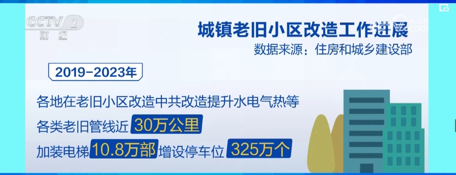 數(shù)據(jù)顯示,2019年—2023年,全國(guó)累計(jì)開工改造老舊小區(qū)22萬個(gè),惠及居民3800多萬戶、近1億人。各地在老舊小區(qū)改造中,共改造提升水電氣熱等各類老舊管線近30萬公里,加裝電梯10.8萬部,增設(shè)停車位325萬個(gè)、電動(dòng)汽車充電樁10.4萬個(gè)、電動(dòng)自行車充電樁68萬個(gè),增設(shè)養(yǎng)老托育等各類社區(qū)服務(wù)設(shè)施6.8萬個(gè)。