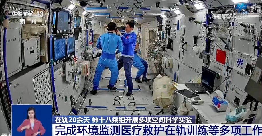 在按計劃開展科學實(試)驗及實驗裝置維護的同時,三名航天員還完成了空間站內(nèi)環(huán)境監(jiān)測、醫(yī)療救護在軌訓練等多項工作。