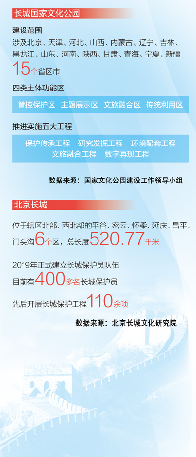 隨著長(zhǎng)城國(guó)家文化公園建設(shè)推進(jìn),各地不斷創(chuàng)新長(zhǎng)城保護(hù)方式,長(zhǎng)城的保護(hù)狀況持續(xù)改善。2019年,中辦、國(guó)辦印發(fā)《長(zhǎng)城、大運(yùn)河、長(zhǎng)征國(guó)家文化公園建設(shè)方案》。2021年,國(guó)家文化公園建設(shè)工作領(lǐng)導(dǎo)小組印發(fā)的《長(zhǎng)城國(guó)家文化公園建設(shè)保護(hù)規(guī)劃》提出,著力將長(zhǎng)城國(guó)家文化公園打造為弘揚(yáng)民族精神、傳承中華文明的重要標(biāo)志。