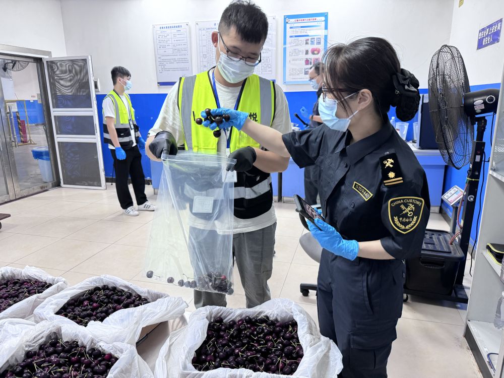 廣州白云機場海關關員對新產(chǎn)季進口車厘子進行監(jiān)管。(受訪者供圖)