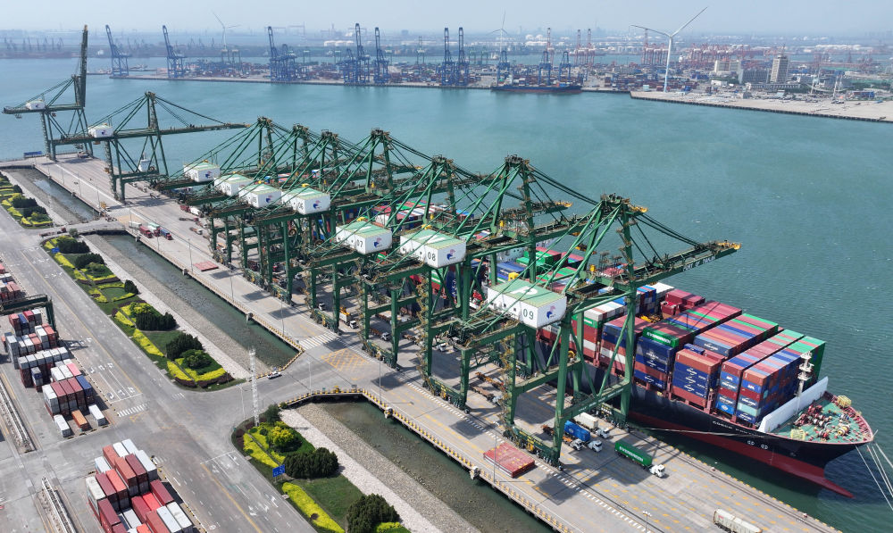 貨輪靠泊在天津港太平洋國(guó)際集裝箱碼頭裝載貨物(無人機(jī)照片,5月29日攝)。新華社記者 趙子碩 攝